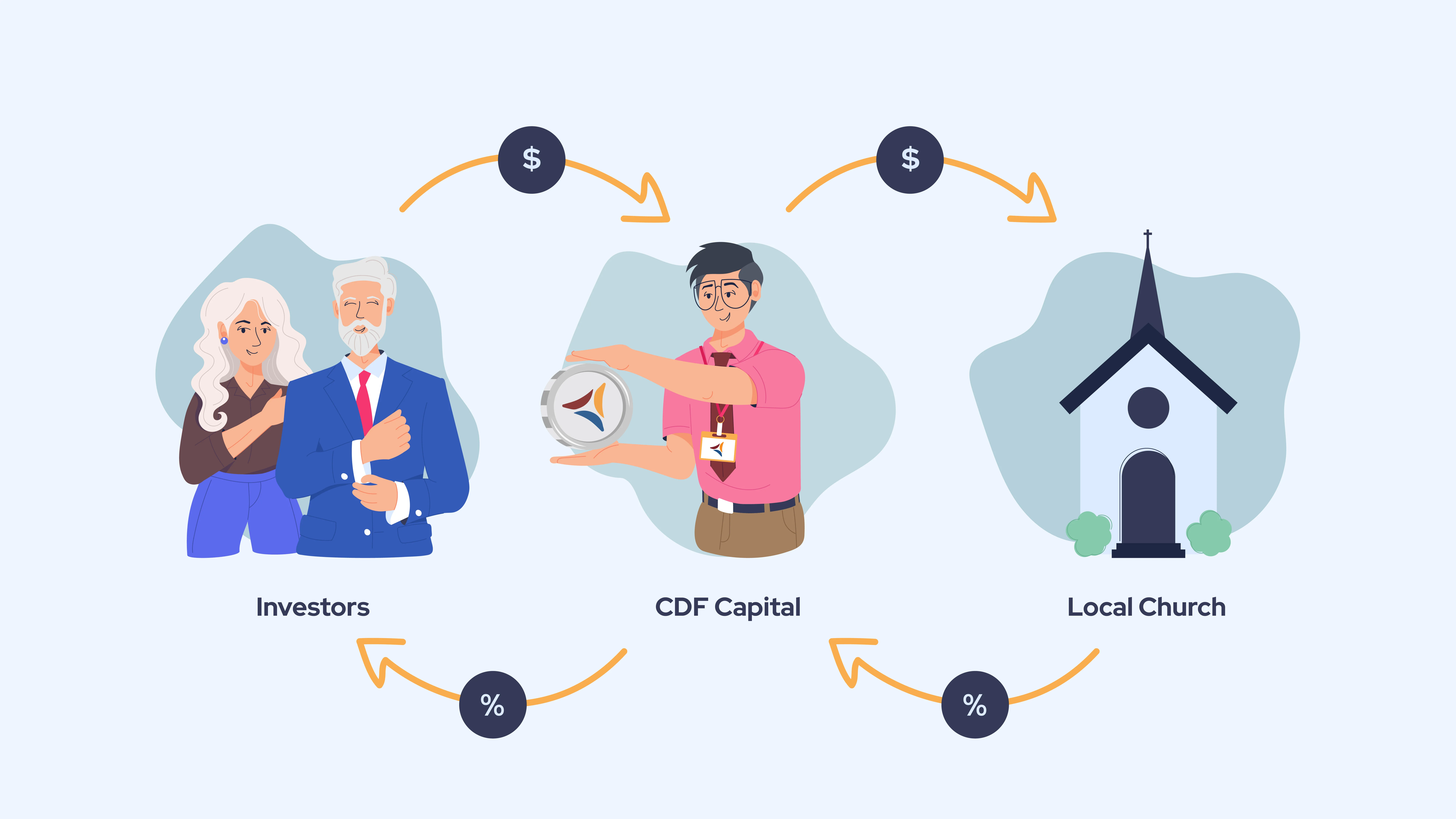 Investors in CDF Capital commit dollars to make loans to churches. As churches pay down their mortgages, investors earn a return on their funds: